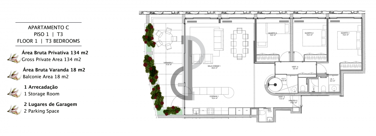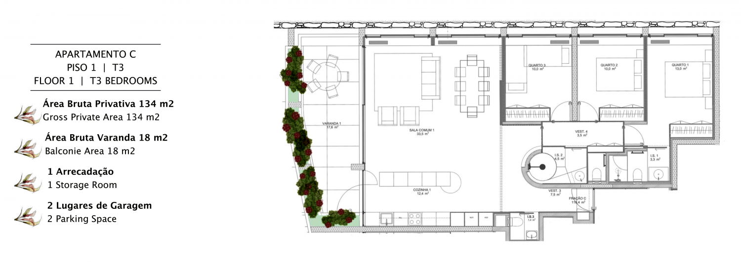 Fração C Sublime Apartamento T3 com grande varanda Exclusividade no coração do Porto •Empreendimento premium com apenas 6 apartamentos T2 e T3 •Unidades com varandas e terraços privativos •Um projeto pensado para quem procura sofisticação, conforto e privacidade Uma localização de excelência •Situado numa das zonas mais prestigiadas do Porto •A poucos passos de: -Avenida da Boavista -Parque da Cidade -Praias do Porto •Envolvido por uma oferta completa de: -Colégios e universidades -Comércio e serviços -Transportes Design que inspira •Arquitetura elegante e intemporal, assinada por gabinete de referência •Apenas 3 pisos, garantindo um ambiente exclusivo e tranquilo •Espaços amplos e luminosos, com ligação fluida ao exterior •Varandas e terraços que convidam a viver o melhor do indoor/outdoor Acabamentos de excelência •Materiais nobres e seleção criteriosa de detalhes •Pavimentos exteriores em granito “Amarelo Real” •Interiores com soalho de madeira natural •Guardas em ferro pintado com design clássico e sofisticado Cada fração inclui: -Lugar de garagem -Espaço de arrumação Viver com qualidade •A poucos minutos do mar e rodeado de natureza •Um refúgio urbano que combina: -Tranquilidade -Prestígio -Proximidade ao essencial Ideal para quem valoriza um estilo de vida exclusivo e equilibrado Previsão de conclusão: Final de 2026 Orientação Norte/Poente Piso 1 2 Lugar de garagem - Planta e tabela com imóveis disponíveis na secção de fotografias - Fotografias 3D gerais do empreendimento Agende já a sua visita! Douro Project Real Estate